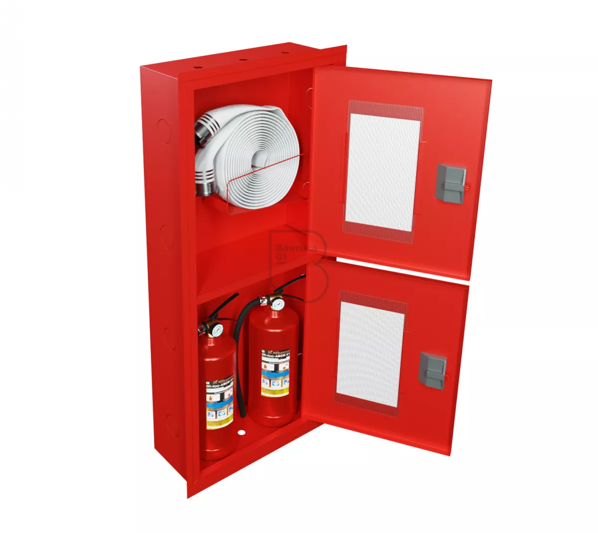 Дверцы пожарного шкафа открываются на 160 градусов. Имеют запорное устройство в виде пластиковой защелки. На каждой дверце имеется смотровое окно со вставкой из поликарбоната.