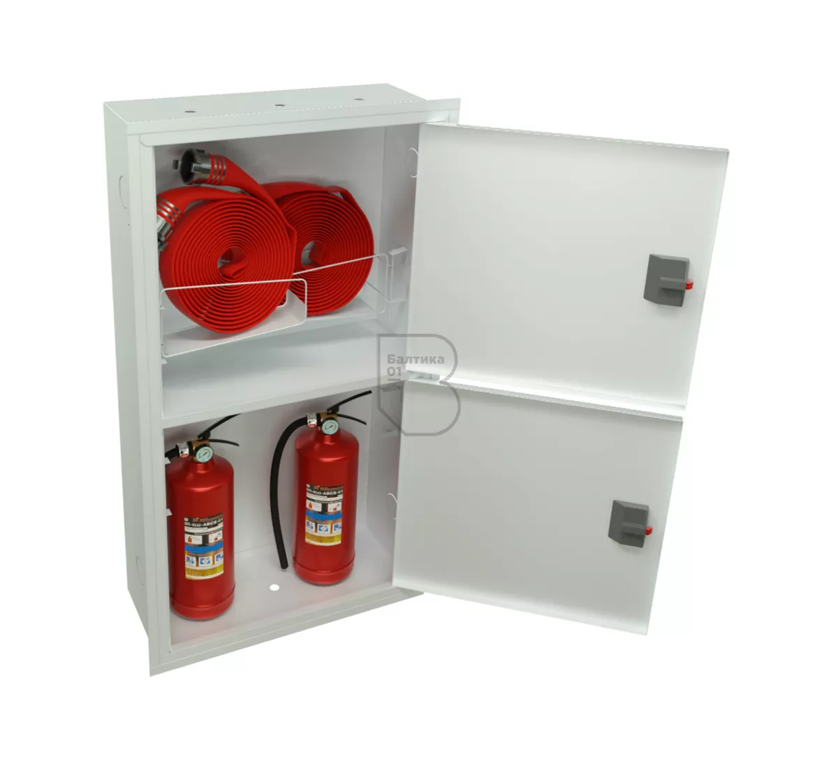 Шкаф ШПК-320-12 ВЗБ имеет в верхнем отсеке две кассеты (корзины), что позволяет подсоединять два крана с обеих сторон. Нижний отсек предназначен для хранения двух огнетушителей до 10 кг. Дверцы пожарного шкафа открываются на 160 градусов. Имеют запорное устройство в виде пластиковой защелки.